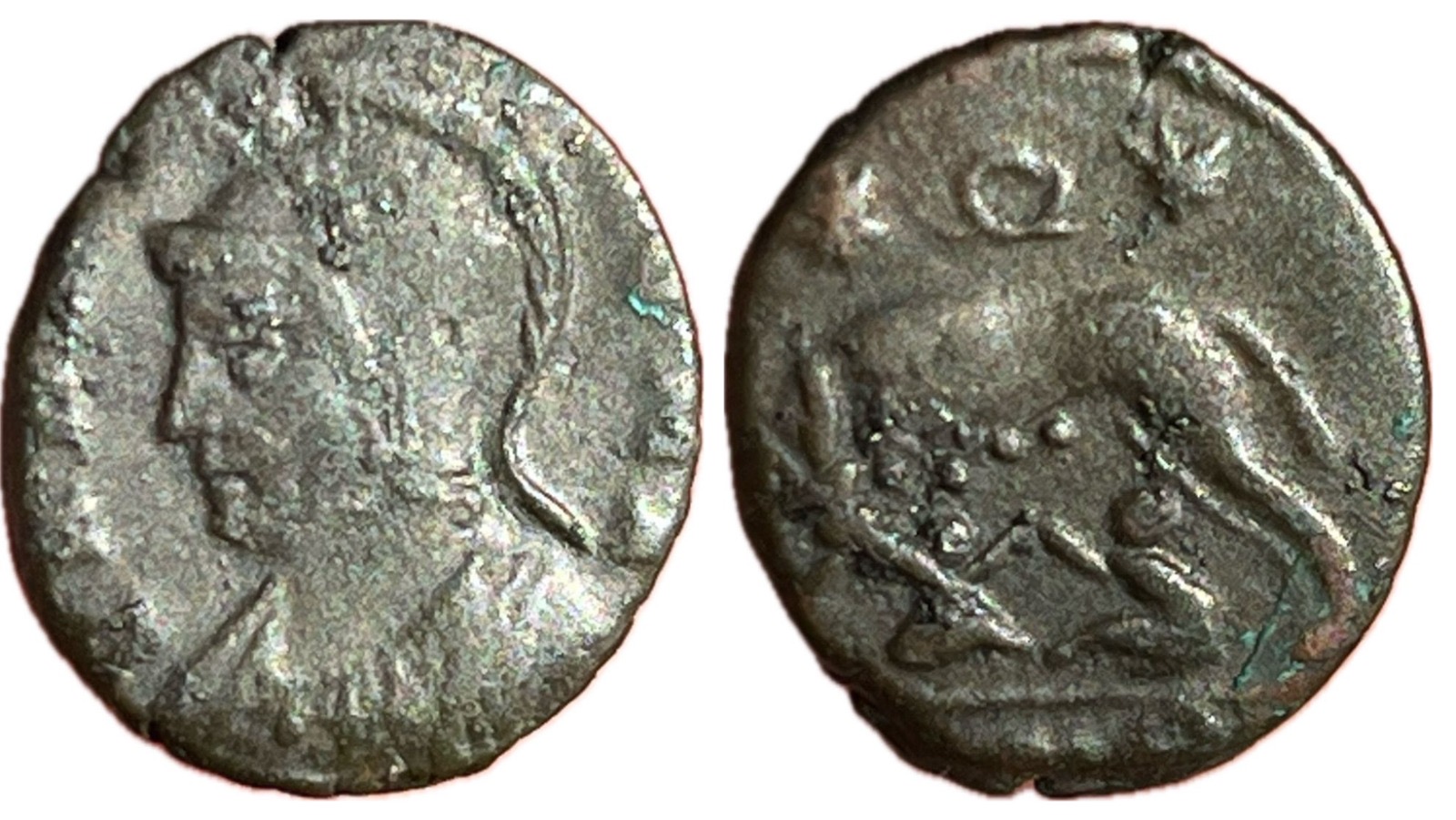 Obverse: VRBS ROMA, helmeted bust of Roma to left, wearing imperial mantle