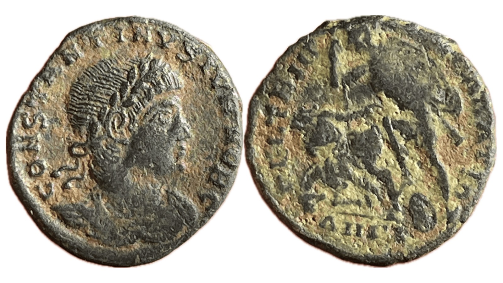 Obverse: D N CONSTANTIVS P F AVG. Pearl-diademed, draped, and cuirassed bust right.