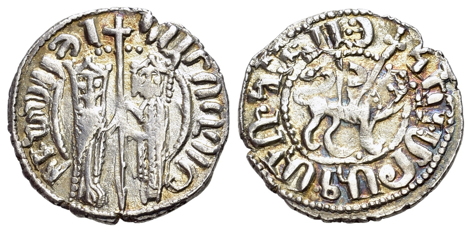 Armenia, Hetoum I (1226-1270). AR Trams (20mm, 2.90g, 12h). Zabel and Hethoum standing facing, long cross between. R/ Lion r. (Bed 1424/1521).